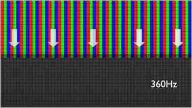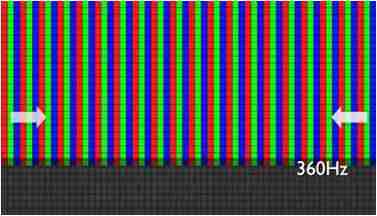 传统液晶驱动是从左到右单向进行,,,,在画面更新速度愈来越愈快的情况下,,,位于驱动线路末端的右下角区域,,画素的闸极来不及在短时间内获得足够电压,,,,无法显示出正确的颜色资讯。。 |